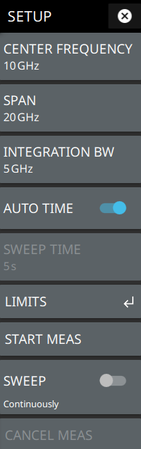 ![]() | CENTER FREQUENCY Sets the center frequency of the sweep range. SPAN Sets the sweep frequency range. Selecting the plus (+) or minus (–) control increments the span value in a 1:2:5 sequence. The span can also be changed by pinching the trace in or out when gestures are not toggled off. INTEGRATION BW Sets the range of integration used in calculating the power in the channel. The integration bandwidth (IBW) is displayed as the shaded region between the bandwidth start and stop thresholds (dashed green lines). AUTO TIME Toggle this button off to manually set the sweep time using the numeric entry keypad. SWEEP TIME Allows to set full manual sweep time range to measure the intermittent or frequency hopping noise. LIMITS Opens LIMITS Menu.Toggle on the C/I, carrier power and interference power limit buttons to verify the PASS/FAIL status of the measured values with respect to the set limits. START MEAS Starts the wizard or sequence of message windows to measure carrier power followed by noise power. SWEEP CONTINUOUSLY Toggle on to enable continuous sweep. Toggle off to freeze the signal or stop the instrument from sweeping. CANCEL MEAS Cancels the measurement of carrier power and/or interference power. |