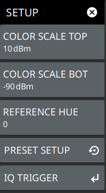 COLOR SCALE TOP Defines the amplitudes where the top color on the color setup bar are applied. Any measurement above this amplitude will appear black on the spectrogram window. COLOR SCALE BOT Defines the amplitudes where the bottom setting colors on the color setup bar are applied. Any measurement below this amplitude will appear black on the spectrogram window. REFERENCE HUE Allows you to customize the Spectrogram color range (Color Bar) and Hue values. The color limits and the reference hue are based on a 360-degree color wheel where default 0 is red (255 0 0). PRESET SETUP Presets the color setup settings. |