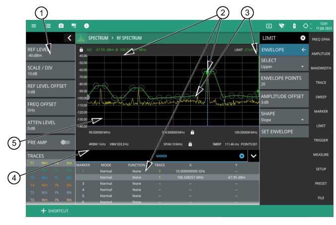 1. Status Panel: Each measurement features a unique status panel that displays settings and information relevant to the current measurement and view settings. Refer to the Status Panel, for more information. 2. Markers: Markers are displayed as green diamonds on the trace to which they are assigned. The active marker is shown as a solid green diamond with a dashed vertical line. The marker amplitude and frequency will be displayed in green text on the top left edge of the display. In this example, a marker is shown at the signal peak with the marker table enabled. Double tap the marker to open a quick access peak search menu. 3. Limit Lines: Limit lines are shown as red (failing) or green (passing) lines with gray circles for each limit line point. Limit lines can be set up point-by-point or by using the envelope feature to quickly set a sloped or square envelope. The currently selected limit line point is shaded in gray. When limit lines are enabled, a pass/fail status is shown in the upper right of the window. If the trace crosses the limit, the trace color will turn red and the limit will indicate a failure. The limit is only applied to the active trace (see Section 3-7 “Setting Trace Parameters”), which is indicated next to the pass/fail. 4. Measurement Settings: The x-axis shows the start, center, and stop frequencies. The y-axis displays the amplitude of the graticule lines. RBW/VBW, span, sweep time, and number of trace point settings are shown along the bottom of the spectrum display. If either resolution bandwidth or video bandwidth is set to manual, the “#” symbol will precede its label. If an offset frequency is entered, the offset value is displayed in the left side status panel. Selecting any of the editable parameters opens the keypad to edit the value directly. Information-only displays cannot be changed. 5. Multiple Trace Display: Each trace has a unique color and each can be set to Clear/Write, Average, Min or Max Hold, Rolling Average, Rolling Min or Max Hold, T1-T2, T2-T2. Traces can have Peak, RMS/Average, Negative, Sample, or Normal detectors. Traces can be set to Active, Hold/View, or Blank. |