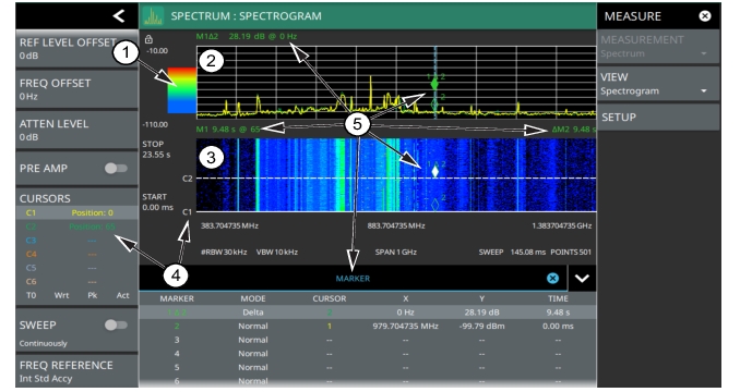 1. Color Bar: The color bar is used to adjust the colors displayed at different amplitude levels. The color bar shown here represents the range of colors that will be displayed. This bar can be dragged up or down to adjust the coverage area. If signals or noise is outside of the color bar range, then black is displayed. The color bar top and bottom setting, and the overall hue to the color range is set via the “SETUP Menu (Spectrogram View)” on page 3‑132, which can be opened by pressing the color bar. 2. Spectrum Window: The upper display area shows spectrum trace data in the frequency domain. Up to six traces can display data from different times depending on how the corresponding cursors are set in the spectrogram display below. Note that the spectrum display shows trace amplitude (vertical axis) data in the time (horizontal axis) domain. 3. Spectrogram Window: The lower display area shows spectrogram trace data in the time (vertical axis), frequency (horizontal axis), and amplitude (color) domains. The bottom of the spectrogram displays the current sweep at the current time (0 ms) or position 0. When a sweep completes, the entire display is shifted up and the new trace is added to the bottom of the spectrogram. The spectrogram holds 142 sweeps (cursor positions) and the stop time reflects the time taken to complete all of the sweeps. 4. Cursors (C1 to C6): Cursor information for the currently set cursor type (time or position) is shown in the status panel. Cursors are shown on the spectrogram as white lines at the currently set cursor time or position. Refer to “Spectrogram with Cursors and Markers” on page 3‑51. 5. Markers: Marker and marker data are shown in a variety of locations. Markers can be placed on different cursors to help you compare measurements at different points in time as well as frequency. Refer to “Spectrogram with Cursors and Markers” on page 3‑51. |