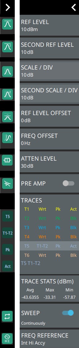 REF LEVEL Sets the reference level of the top graticule line in the selected units. If the reference level offset is not zero, OFFSET REF LEVEL is displayed at this location. Refer to Section 3-4 “Setting Amplitude Parameters” on page 3‑9. SECOND REF LEVEL The reference level is the top graticule line to the right on the measurement display. Its functionality is exactly same as reference level, but it is only available when trace math is enabled. SCALE/DIV Sets the graticule scale/division for log-based units. This setting does not apply to linear units SECOND SCALE/DIV It applies to second reference level and is available only when trace math is enabled. REF LEVEL OFFSET Sets the reference level offset in dB units. This setting can compensate for the presence of external input attenuation or gain. FREQ OFFSET Accounts for frequency conversions outside of the analyzer. Refer to Section 3-3 “Setting Frequency Parameters” on page 3‑2. ATTEN LEVEL When auto attenuation is off, sets input attenuation. PRE AMP Toggles the low-noise front-end preamplifier on or off. Refer to Section 3-4 “Setting Amplitude Parameters” on page 3‑9. TRACES/CURSORS Displays the current status of up to six traces or cursors in a quick-view summary. When the measurement view is set to RF Spectrum, trace information is displayed in this area. When the measurement view is set to Spectrogram, cursor information is displayed in this area. Cursors are available in the Spectrum measurement with the Spectrogram view selected. The summary information includes the trace or cursor number, type, mode, and detector type. The active trace will show a highlighted background with the mode and detector type restated under the table. In Spectrogram, a reference trace (T0) will show you the settings of the trace used to fill the spectrogram. The reference trace settings are applied to all traces and cursors while in Spectrogram view. Selecting a trace or cursor in the summary panel activates the pressed trace or cursor and opens the TRACE menu, allowing you to select and set up an individual trace or cursor as desired. Refer to Section 3-7 “Setting Trace Parameters” on page 3‑22. TRACE STATS (dBm) Displays the spectrum analyzer received Maximum, Average, and Minimum power of each frequency range sweep. SWEEP Toggles the current sweep setting between continuously or sweep once. Refer to Section 3-8 “Setting Sweep Parameters” on page 3‑39. FREQ REFERENCE Indicates the current frequency reference source of Internal High Accuracy (used after GPS has lost sync, but while the internal clock still has good GPS reference), Internal Standard Accuracy, External, or GNSS (GPS) Hi Accy (requires GPS). The instrument automatically selects the frequency reference in the following order of priority: external, GPS, then the internal time base. | ||