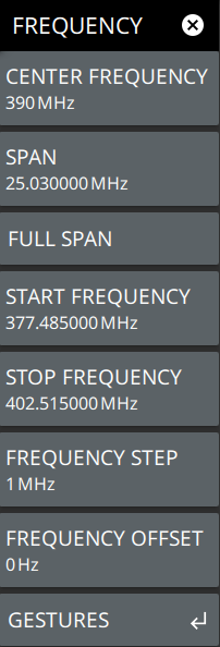 - ![]() | CENTER FREQUENCY Sets the center frequency of the sweep range. The current span setting will remain constant or will be adjusted to accommodate the start and stop frequency range of the instrument. The center frequency can also be dragged on the display when gestures are not toggled off. SPAN Sets the sweep frequency range. The current center frequency will remain constant and the start and stop frequencies will be adjusted to accommodate the new range. Selecting the plus (+) or minus (–) control increments the span value in a 1:2:5 sequence. The span can also be changed by pinching the trace in or out when gestures are not toggled off. FULL SPAN Selecting this button sets the span to cover the entire tunable spectrum of the instrument. START FREQUENCY Sets the start frequency of the sweep range. The center frequency and span will be adjusted to accommodate the new start and current stop frequencies. Selecting the plus (+) or minus (–) control moves the start frequency in steps defined by the FREQUENCY STEP value. STOP FREQUENCY Sets the stop frequency of the sweep range. The center frequency and span will be adjusted to accommodate the current start and new stop frequencies. Selecting the plus (+) or minus (–) control moves the start frequency in steps defined by the FREQUENCY STEP value (set lower in this menu). FREQUENCY STEP Sets the frequency step value used for the plus (+) or minus (–) control. FREQUENCY OFFSET The frequency offset value accounts for frequency conversions outside of the analyzer. The offset frequency value is added to the start, stop, center, fixed marker, and normal marker frequencies. Selecting the plus (+) or minus (–) control moves the offset frequency in steps defined by the FREQUENCY STEP value. GESTURES Opens the GESTURES Menu. Gestures is only available in RF measurements, not available in WCDMA measurement. |