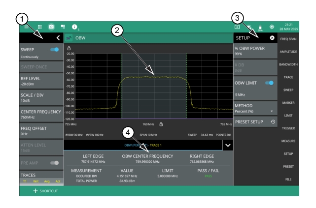 1. The status panel provides quick access to common spectrum analyzer settings. See STATUS PANEL (Occupied BW). 2. Dashed vertical lines and a shaded region define the main channel. 3. All occupied bandwidth measurement parameters are set via the SETUP menu. See SETUP Menu (Occupied BW). 4. Occupied bandwidth measurement results are shown in a table at the bottom of the display. |