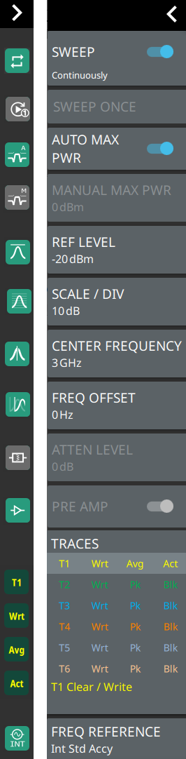 ![]() | SWEEP Toggles the current sweep setting between continuously or sweep once. Refer to Setting Sweep Parameters. SWEEP ONCE When sweep is set to single sweep, SWEEP ONCE updates the measurement display. Data continues to be captured in the background. AUTO MAX PWR Toggle auto maximum power to set the maximum power automatically. MANUAL MAX PWR Enables when Auto Max Power is toggled. REF LEVEL Sets the reference level of the top graticule line in the selected units. If the reference level offset is not zero, OFFSET REF LEVEL is displayed at this location. Refer to Setting Amplitude Parameters. SCALE/DIV Sets the graticule scale/division for log-based units. This setting does not apply to linear units. FREQ OFFSET Accounts for frequency conversions outside of the analyzer. Refer to Setting Frequency and Bandwidth Parameters. ATTEN LEVEL When auto attenuation is off, sets input attenuation. CENTER FREQUENCY Sets the center frequency of the sweep range. The current span setting will remain constant or will be adjusted to accommodate the start and stop frequency range of the instrument. The center frequency can also be dragged on the display when gestures are not toggled off. PRE AMP Toggles the low-noise front-end preamplifier on or off. Refer to Setting Amplitude Parameters. TRACES Displays the current status of up to six traces in a quick-view summary. The summary information includes the trace number, type, mode, and detector type. The active trace will show a highlighted background with the mode and detector type restated under the table. Pressing a trace in the summary panel activates the pressed trace and opens the TRACE menu, which allows you to select and set up an individual trace as desired. Refer to Setting Trace Parameters. FREQ REFERENCE Indicates the current frequency reference source of Internal High Accuracy (used after GPS has lost sync, but while the internal clock still has good GPS reference), Internal Standard Accuracy, External, or GNSS (GPS) Hi Accy (requires GPS). The instrument automatically selects the frequency reference in the following order of priority: external, GPS, then the internal time base. | |