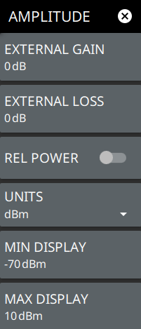 ![]() | EXTERNAL GAIN Sets the external gain value. Minimum is 0 dB and the maximum value is 100 dB. EXTERNAL LOSS Sets the external loss value. Minimum is 0 dB and the maximum value is 100 dB. REL POWER Turns relative power on or off. This measurement shows the relative level of the desired base power level input to your instrument. The power level becomes 0 dB when toggled on. For example, if you are measuring a 10 dBm signal, and REL POWER is enabled, then a drop to 7 dBm will show as –3 dB and 50 %. UNITS Selects the measurement units of either dBm or watts. MIN DISPLAY Sets the minimum value of the analog scale. MAX DISPLAY Sets the maximum value of the analog scale. |