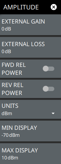 ![]() | EXTERNAL GAIN Sets the external gain value. Minimum is 0 dB and the maximum value is 100 dB. Changes to the external gain will update the display min and max values and limit upper and lower values. EXTERNAL LOSS Sets the external loss value. Minimum is 0 dB and the maximum value is 100 dB. Changes to the external loss will update the display min and max values and limit upper and lower values. FWD REL POWER Enables or disables the forward relative power level. When turned on, power readings are made relative to the power value that was measured at the time it is turned on. The forward relative power state will turn off automatically when forward measurement mode is changed. When measurement mode is CCDF or CREST, turning on relative is not allowed. REV REL POWER Enables or disables the reverse relative power level. When turned on, power readings are made relative to the power value that was measured at the time it is turned on.The reverse relative power state will turn off automatically when reverse measurement mode is changed, and only applies when Reverse Average measurement is selected. UNITS Selects the measurement units of either dBm or watts. MIN DISPLAY Sets the minimum value of the analog scale. MAX DISPLAY Sets the maximum value of the analog scale. |