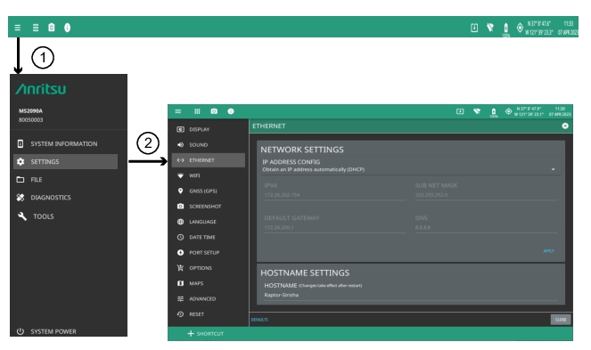 2. Press SETTINGS to access the instrument settings menu, then select either Ethernet or WIFI to change the IP address or HOSTNAME.