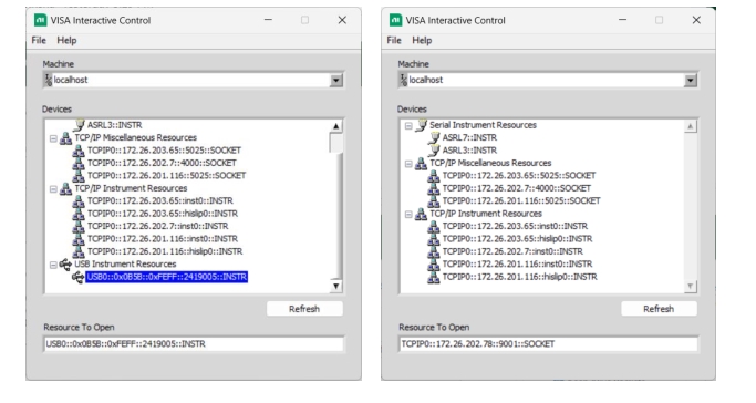 VISA Interactive Control Dialog - USBTMC (left); Ethernet (right)