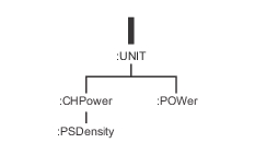 All instrument SCPI commands, except the :ABORt command, have one or more subcommands (keywords) associated with them to further define the instrument function to be controlled. The subcommand keywords may also have one or more associated subcommands (keywords). Each subcommand level adds another layer to the command tree. The command keyword and its associated subcommand keywords form a portion of the command tree called a command subsystem. A sample of the :UNIT command subsystem is shown in Figure: SCPI :Sample :UNIT Subsystem.