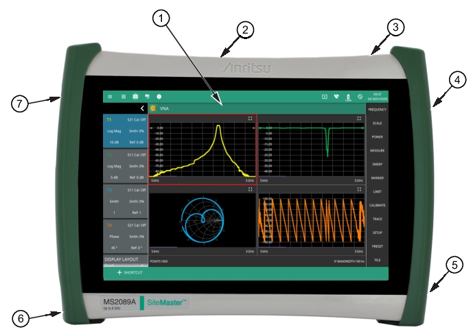 The Site Master uses an LCD touch screen for data input. The menus can vary depending on the current measurement configuration, installed options, and selected instrument function.