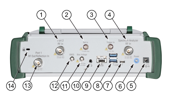 RF input and output, 50 Ω Type-N female connector, for reflection measurements. The maximum input is +30 dBm at ±50 VDC.