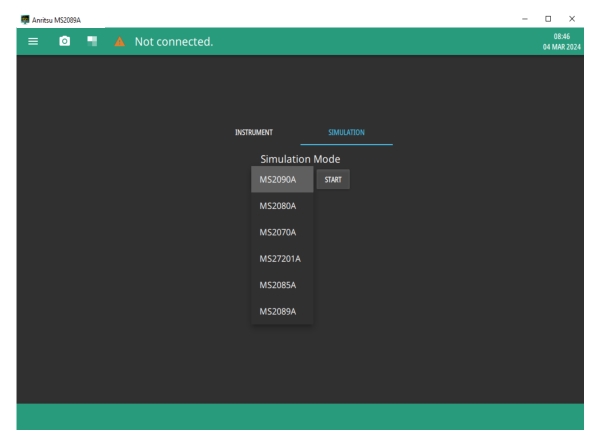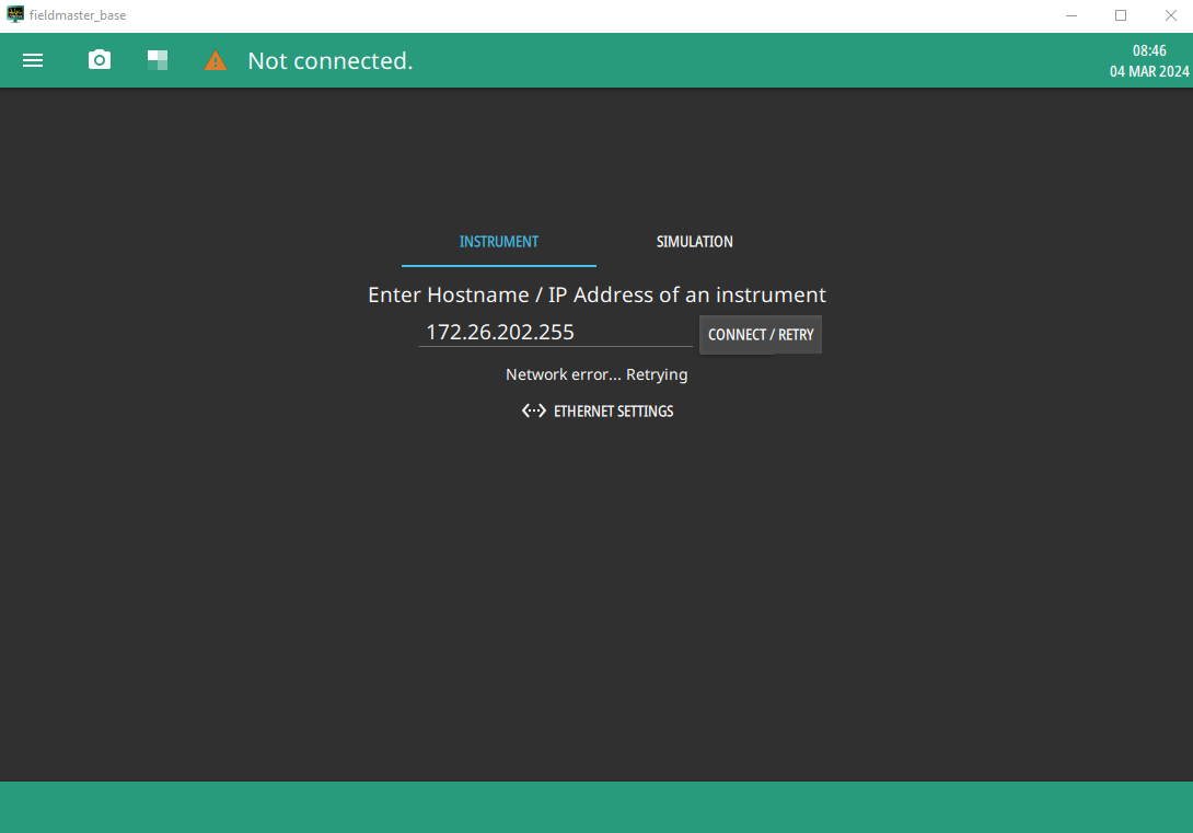 Connecting to a networked instrument or to the simulation mode is established via the system menu. If connecting to an instrument, the instrument must first be connected to the network via Ethernet or Wi-Fi and the hostname/ IP address of the instrument must be known.