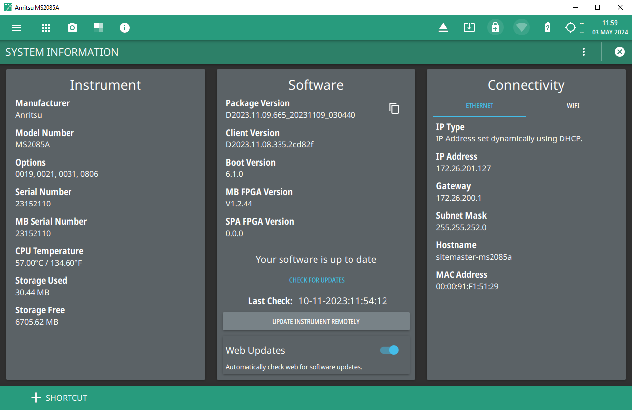 - ![]() | The System menu identifies the instrument model and serial number. HOSTNAME/IP ADDRESS Displayed only on the MS2085A/89A ARRT software. This field is used to specify the IP address or hostname of an instrument that is connected to the network. When SIMULATION MODE (simulation) is toggled on, the software will connect locally to provide some UI functionality. Toggle the simulation mode and select the product from the drop-down and click START button to get connected with the remote PC client. Note that some of the system menus have limited functionality when the software is connected to the simulation. When connected to an instrument, refer to System Menu. SYSTEM INFORMATION Displays information about the instrument and software. SETTINGS Provides access to setting the display color theme and screenshot capture settings (refer to DISPLAY). FILES Opens the Windows file explorer. Refer to FILE (File Management). FILE TRANSFER Opens the FILE TRANSFER. DIAGNOSTICS Opens DIAGNOSTICS. TOOLS Opens the TOOLS Menu. SYSTEM POWER Opens a dialog to RESTART or POWER OFF the instrument. |