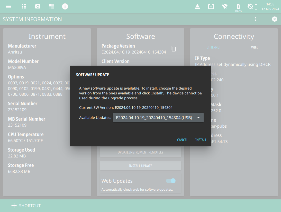 To update your Anritsu instrument software, use a high quality USB memory device with at least 1 GB of free space and FAT32 file system format or update remotely: