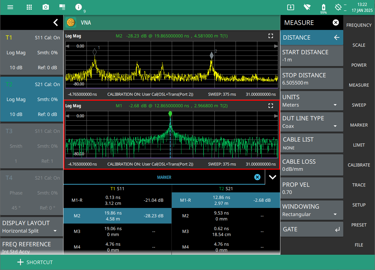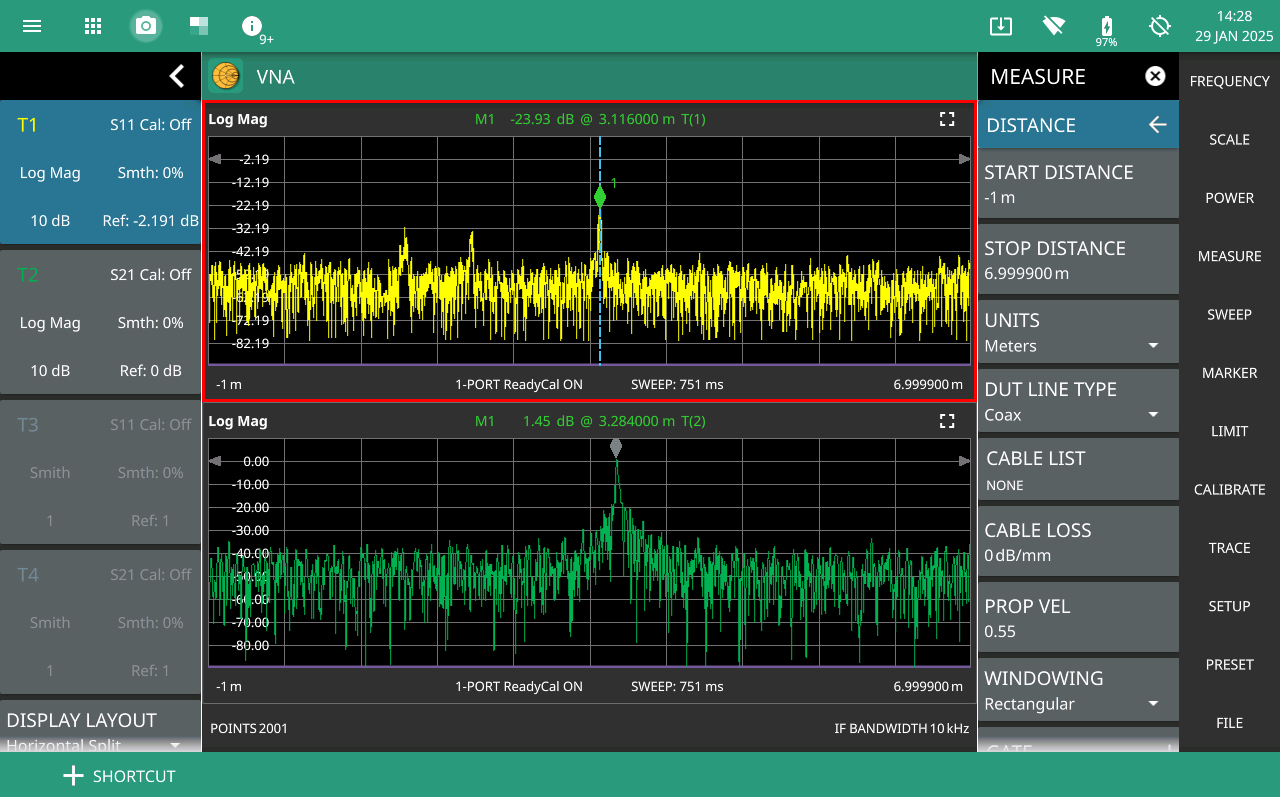 Take a look at what happens in the distance domain for the same cable. As a user, you want the reflection and transmission measurements to show you where the end of the cable is located. Figure: Distance Domain Measurements of a 3.05 m Cable Showing S11 and S21 shows a measured distance domain response of this cable for both reflection (S11) and transmission (S21). The top trace is the S11 plot showing the reflections from both ends of the cable. The bottom trace shows the transmission S21 measurement with the peak representing the signal received at the end of the cable. Looking at the signal, you can see that the reflection and transmission measurements produced the same result for the length of the cable.