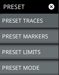 ![]() | PRESET TRACES Presets all trace settings to default values. PRESET MARKERS Presets all marker settings to default values. Turns off all markers. PRESET LIMITS Presets all values on the LIMIT menu to default values. Turns off all limit lines. PRESET MODE Presets all of the current analyzer settings to default values. |