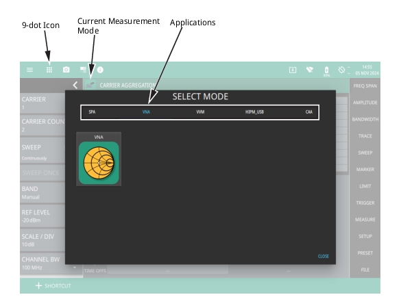 The instrument applications/modes are selected from the 9-dot icon or the current measurement mode. For example, SPA is referred to as an application and the displayed icons are called as modes. To select an application or a mode, press the 9-dot icon in the title bar or the current measurement mode to display all the available applications and corresponding modes, as illustrated in Figure: Instrument Application and Corresponding Mode(s). Simply touch the desired icon to load the new mode, for example, VNA in this case. The applications available for selection depend on the options that are installed and activated on your instrument. Some measurements and views are accessed via other measurement setup menus.