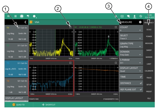 The VNA mode supports six different trace layouts you can select from MEASURE > DISPLAY LAYOUT. The Figure: Vector Network Analyzer Quad Display Layout shows the quad display layout representing all four traces. The status panel displays the individual trace cards that consist of cal type, graph type, smoothing, resolution and reference level. Additionally, if the domain is set to frequency gating, ‘FGT’ is included in parentheses, next to graph type.