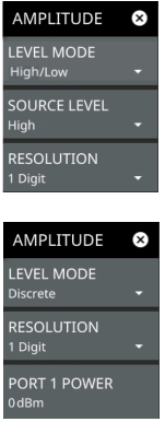 |  | LEVEL MODE Sets the amplitude mode to either High/Low or Discrete. SOURCE LEVEL Sets the internal source power level to high power or low power. The default setting is High, which is more accurate because you are measuring further above the noise floor. Use Low power for devices that are sensitive to higher power levels, such as amplifiers. RESOLUTION Sets the decimal display of the measurement value to 1 or 2 digits after the decimal point. The default setting is 1. PORT 1 POWER Sets the power level on Port 1using the numeric keypad. Only available when LEVEL MODE is set to Discrete. |