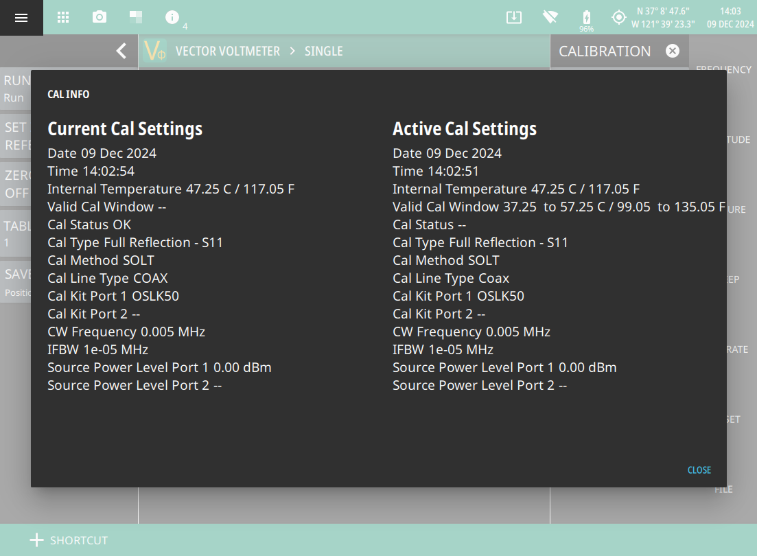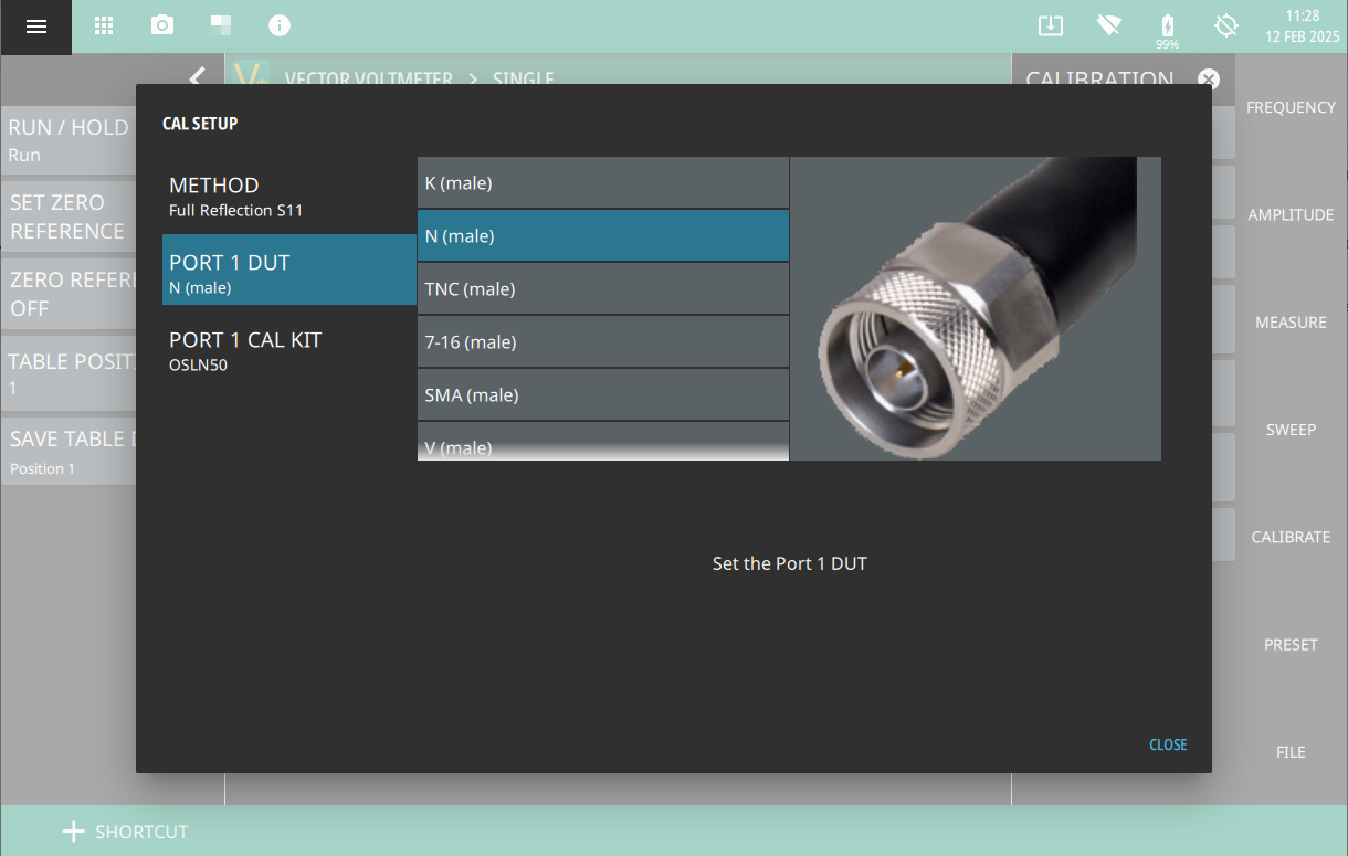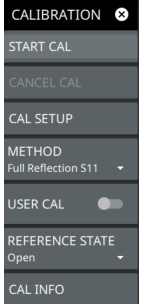 |  | START CAL Starts Calibration. CANCEL CAL Cancels Calibration. CAL SETUP Opens CAL SETUP. METHOD Selects one of the following calibration methods: •	Full Reflection S11: Calibrates Port 1 for reflection measurements only. It requires three calibration components. •	1P2P S11 + S21: Calibrates Port 1 for reflection measurements and S21 measurements only. It requires three calibration components and a through-line. •	Response S11 (Reflection Response, Port 1): Performs simple normalization for Port 1 reflection measurements only. It requires one short or open. •	Transmission S21: Forward Transmission represents the measurement in which the signal leaves Port 1 and is transmitted to Port 2. In this case an external USB power sensor is used as Port 2. USER CAL Turns the USER CAL on/off. REFERENCE STATE Sets the reference state of the end of the cable to either open or short when measuring the cable loss. CAL INFO |